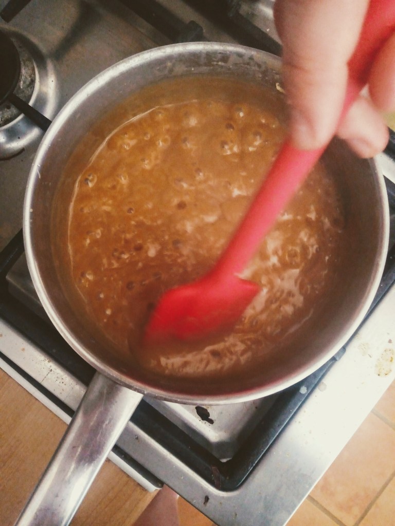 Increase the heat so the mixture comes to a boil. Keep stirring the mixture as it starts to thicken and become golden brown. This may take about 10 mins, don’t worry if it feels like it isn’t thickening, it will get there just keep heating and stirring. Once the mixture has thickened, and looks a golden brown colour, take off the heat.