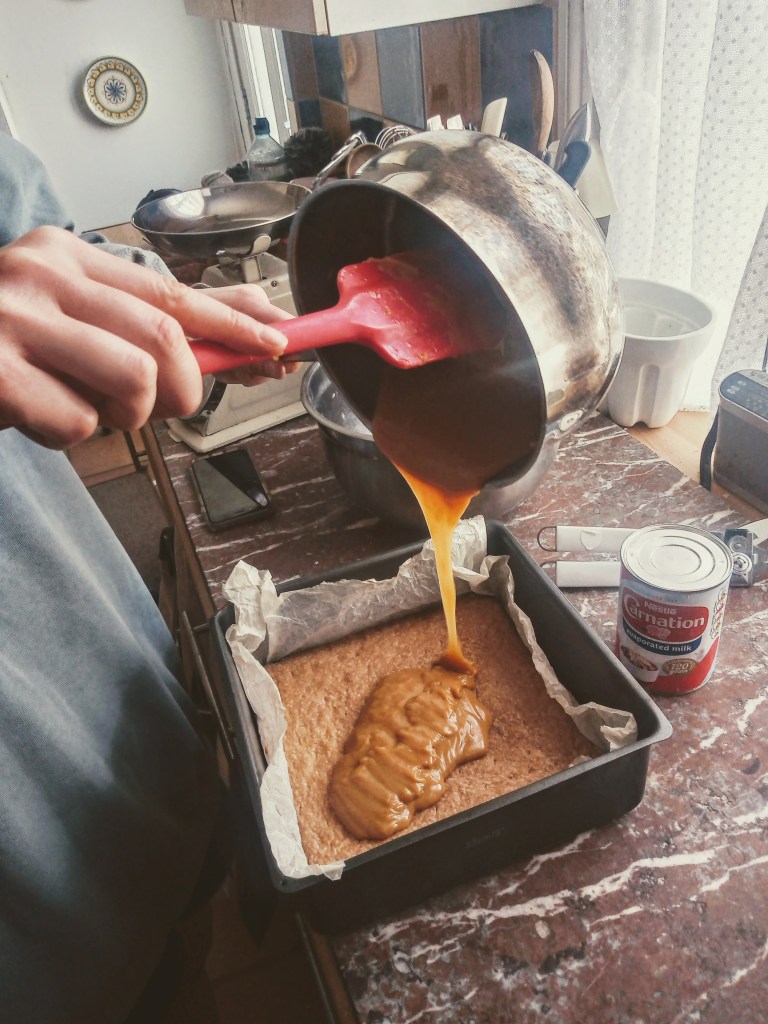 Allow the caramel to cool for 2 mins before pouring over the shortbread base. Smooth the caramel out with the back of a metal spoon and place in the fridge to cool and set.