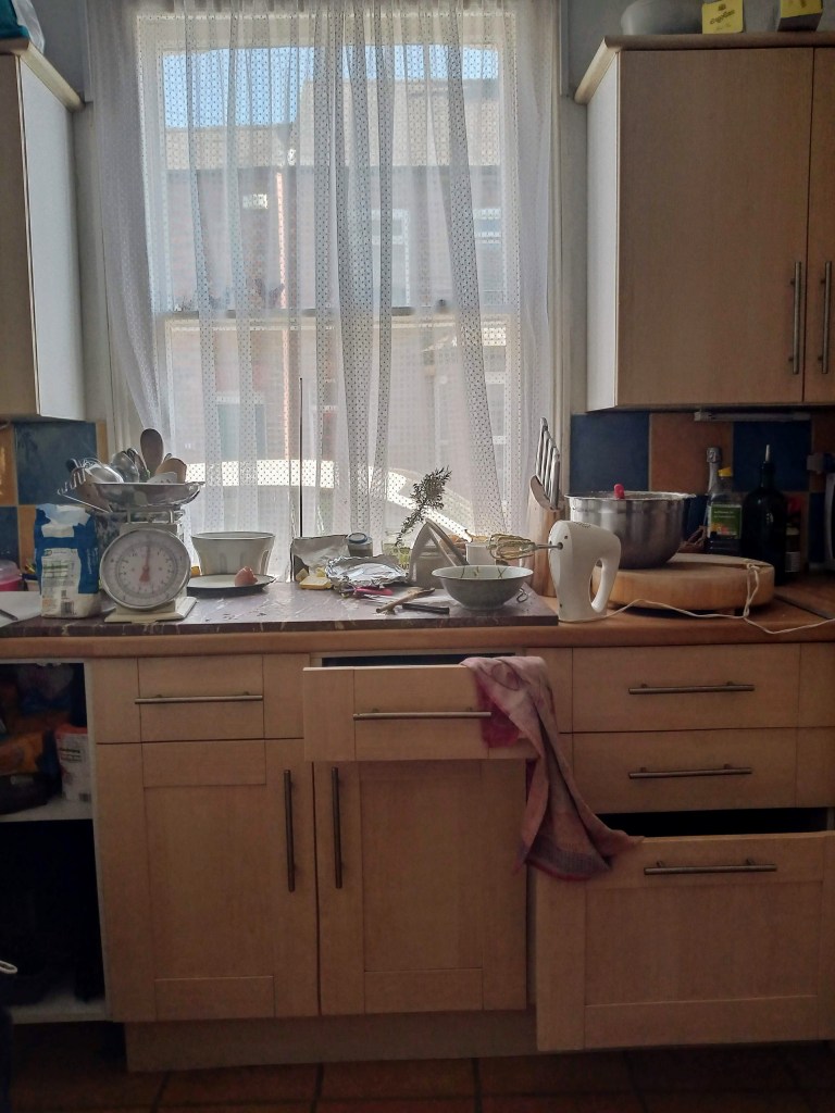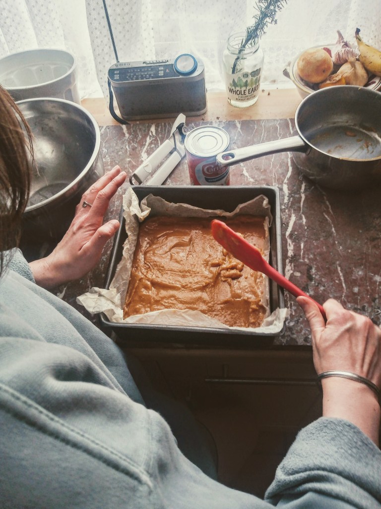 Pre heat the oven to 180. Line a square tin with greaseproof paper. I used a 23cm square tin, but a smaller one would work.
