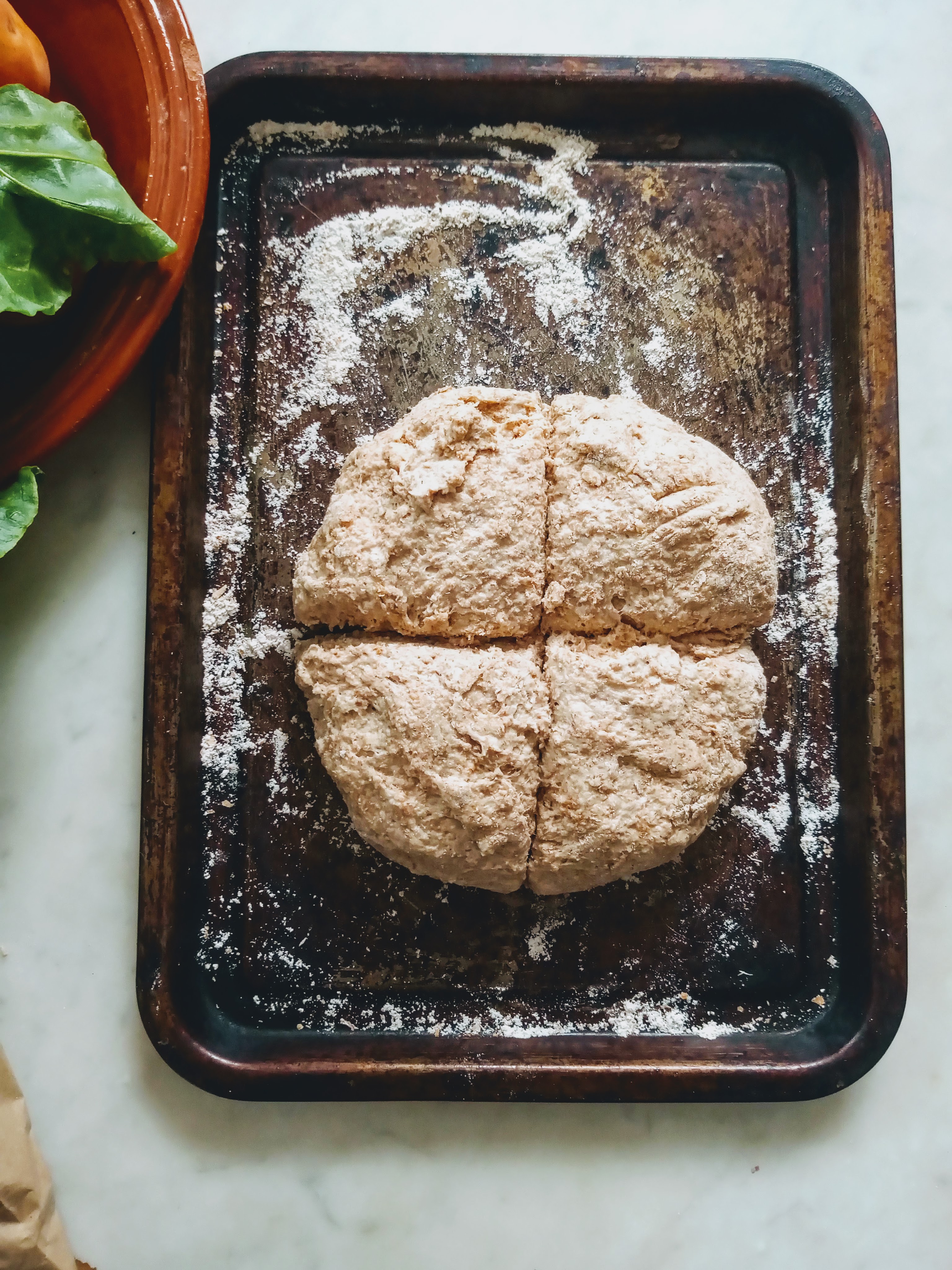 Pre heat the oven to 200 and flour a baking tray, ready for your lil loaf.
