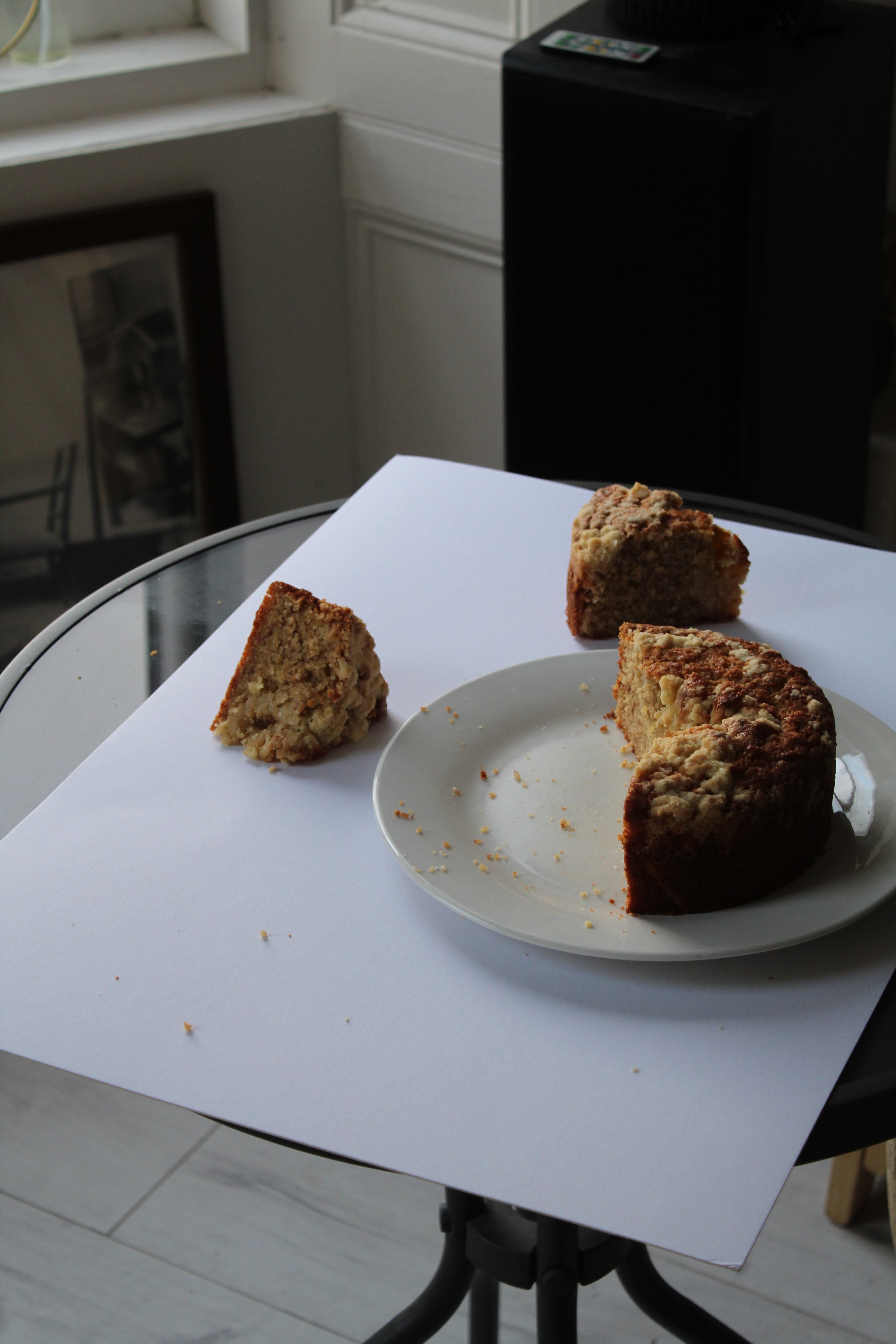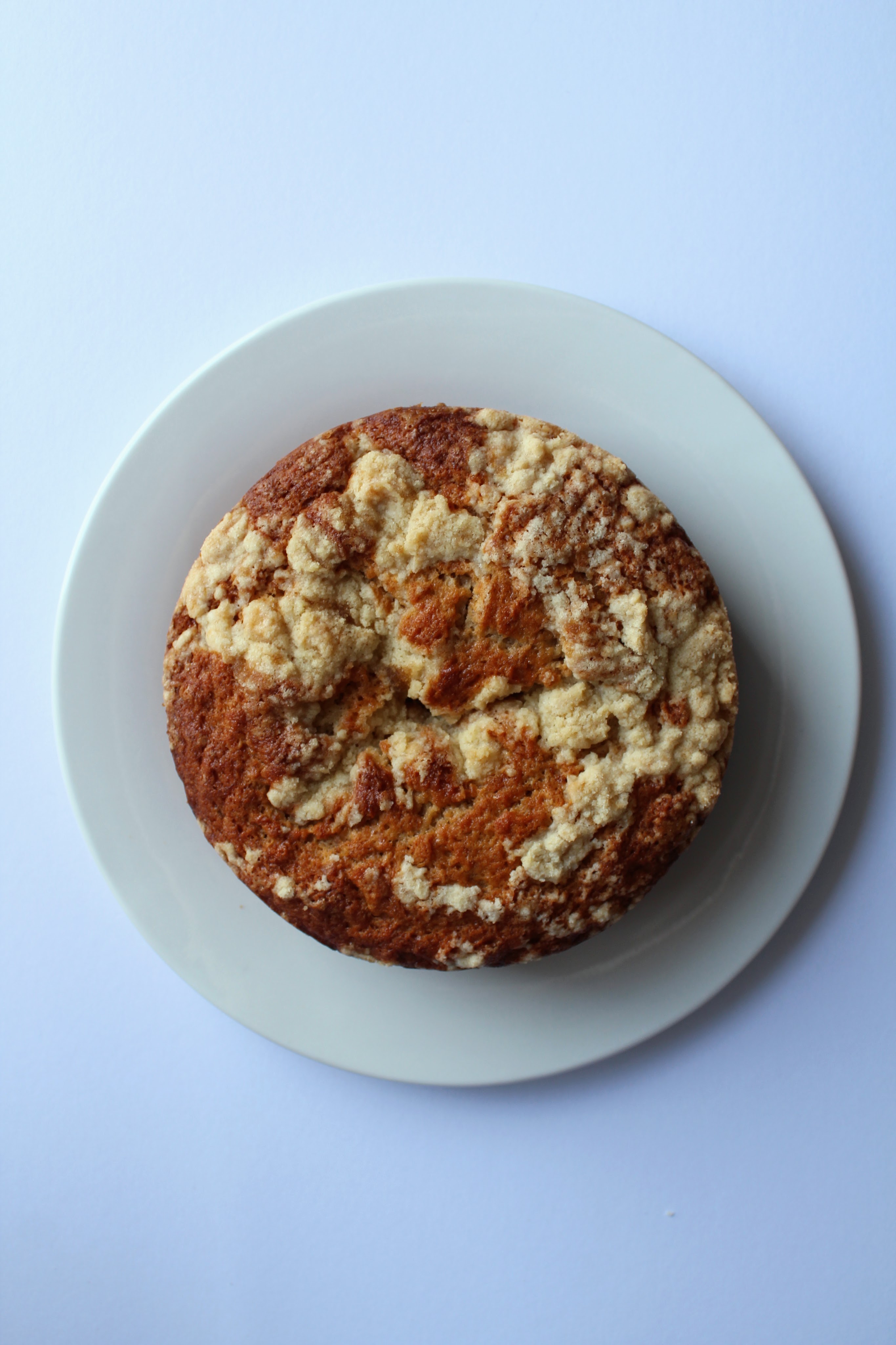 To put it together, level the dome off one of the cakes, save the bit you cut off, this will be your crumb top. Spread half the buttercream over the cake you just levelled and place the second cake on top. If you want to commit to getting the look of this cake, this is the time to carfeully carve off a very thin layer around the outer edge of the sandwiched cake, revealing the inner crumb, and saving the off cuts as a treat for yourself. Of course, you can skip that part. Top the cake with the rest of the buttercream. Crumble up the dome you saved from the base layer of cake. For the final touch, pile the finished cake with your cake crumbs.