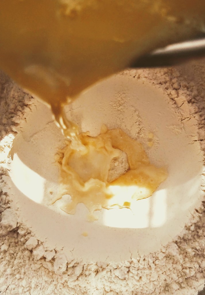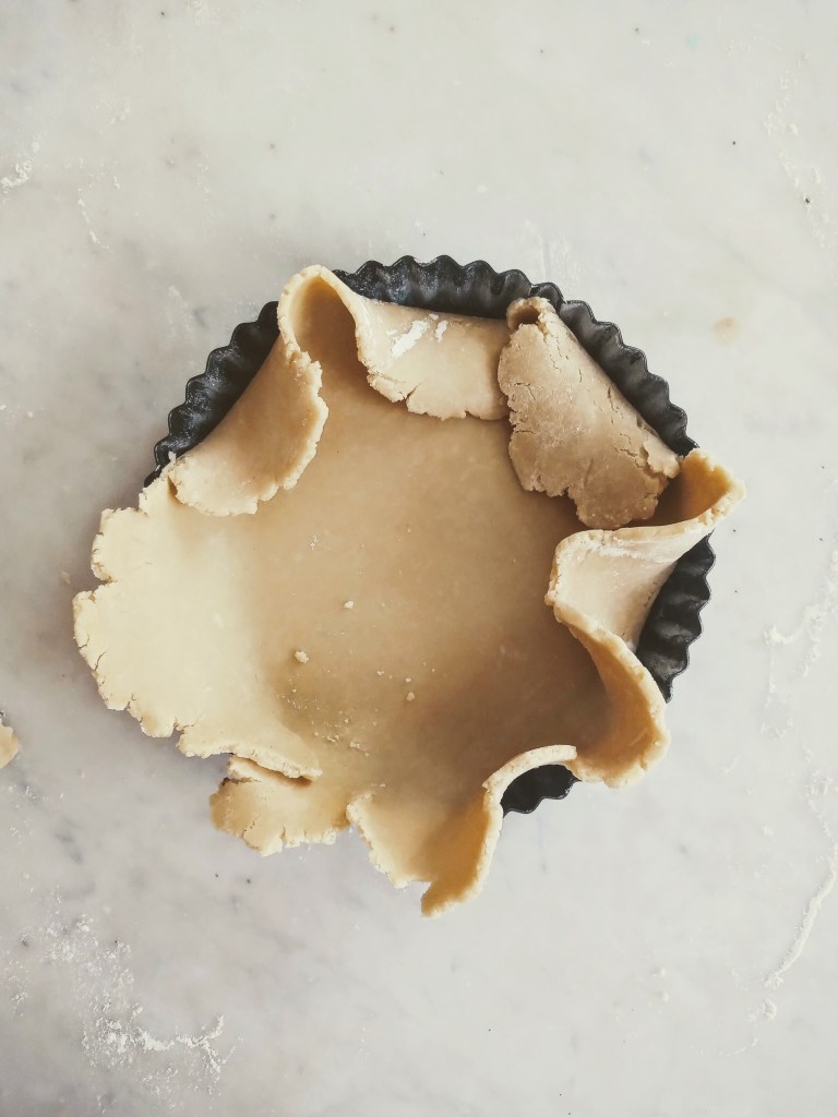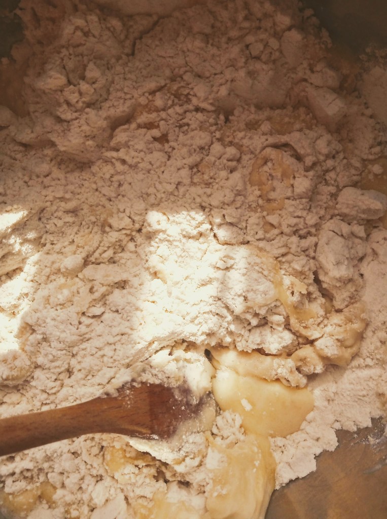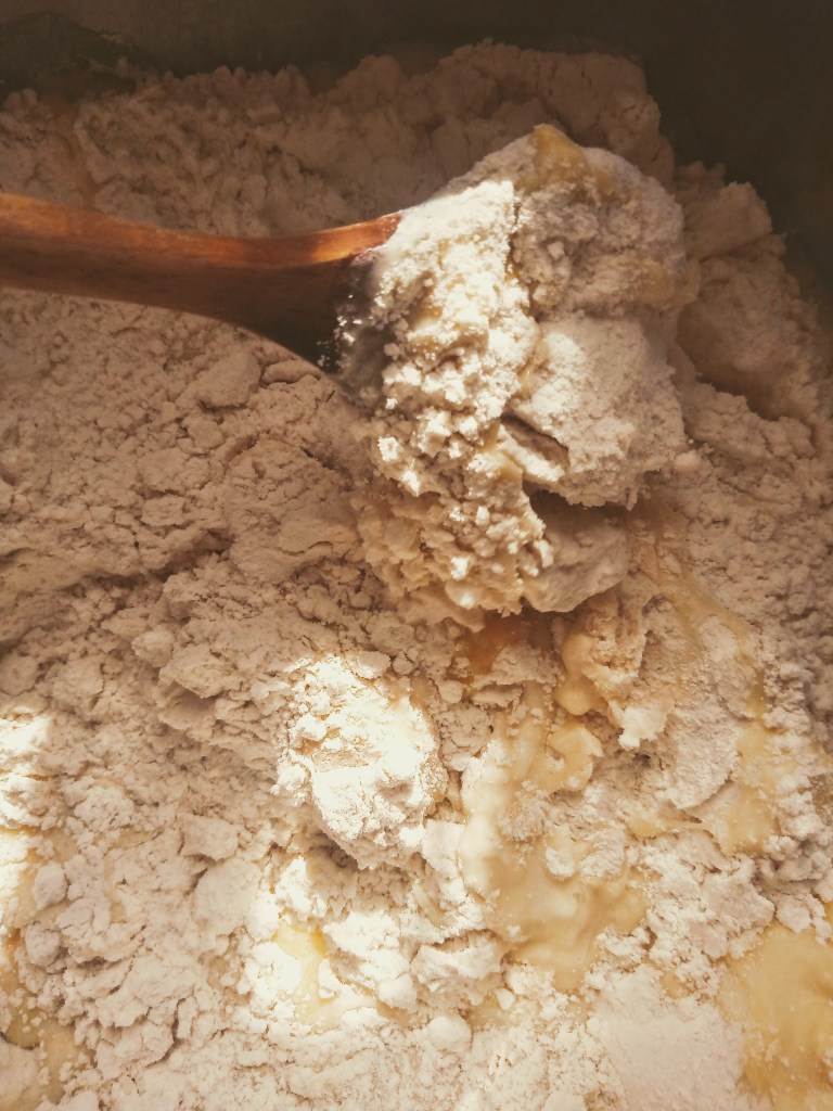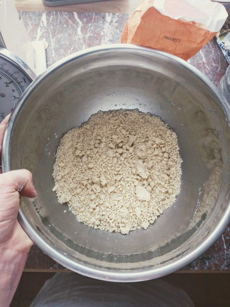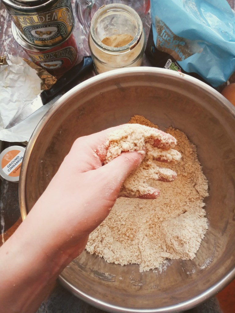 Make the shortbread topping by rubbing all the ingredients together between your fingertips. The mixture will come together in clumps. Once done put in the fridge or freezer while you make the muffin batter.